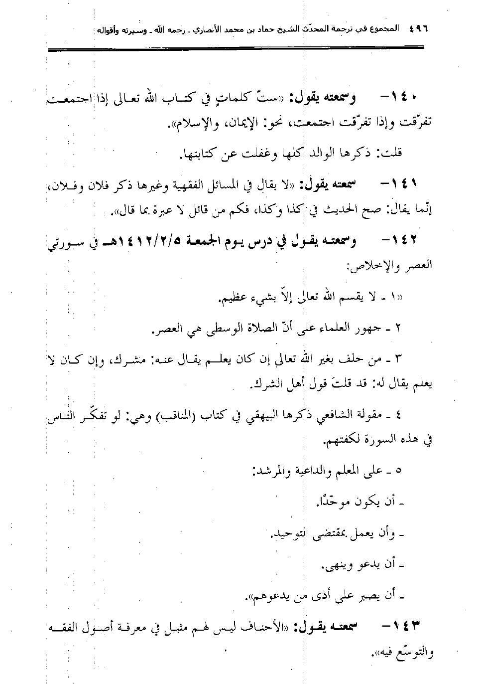140 - وسمعته يقول: "ستّ كلماتٍ في كتاب الله تعالى إذا اجتمعت تفرّقت وإذا تفرّقت اجتمعت، نحو: الإيمان، والإسلام".