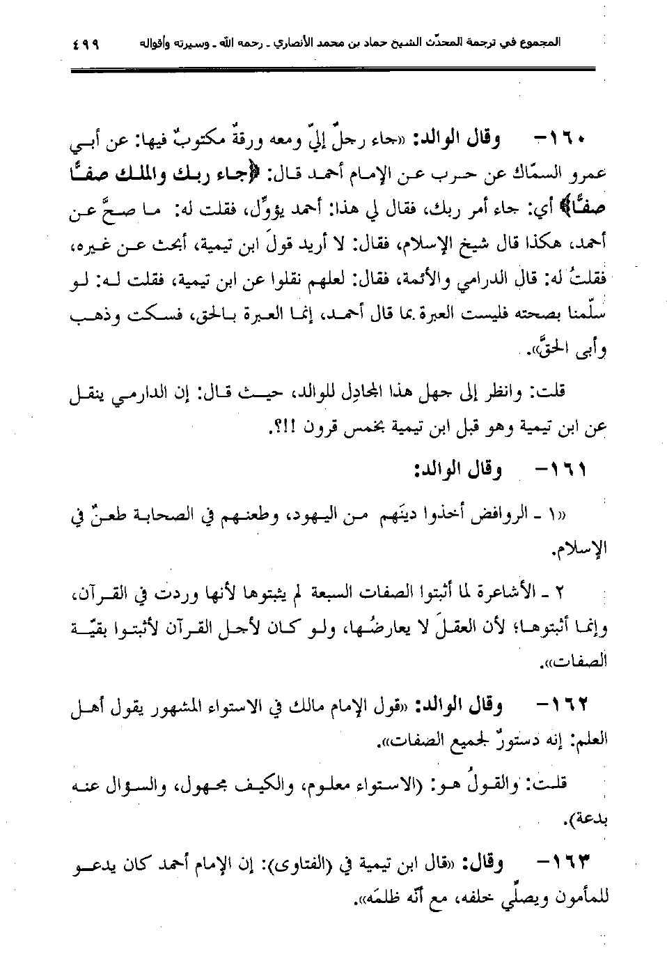 160 - وقال الوالد: "جاء رجلٌ إليّ ومعه ورقةٌ مكتوبٌ فيها: عن أبي عمرو السمّاك عن حرب عن الإمام أحمد قال: {جاء ربك والملك صفًّا صفًّا} أي: جاء أمر ربك، فقال لي هذا: أحمد يؤوِّل، فقلت له: ما صحَّ عن أحمد، هكذا قال شيخ الإسلام، فقال: لا أريد قولَ ابن تيمية، أبحث عن غيره، فقلتُ له: قال الدرامي والأئمة، فقال: لعلهم نقلوا عن ابن تيمية، فقلت له: لو سلّمنا بصحته فليست العبرة بما قال أحمد، إنما العبرة بالحق، فسكت وذهب وأبى الحقَّ".
