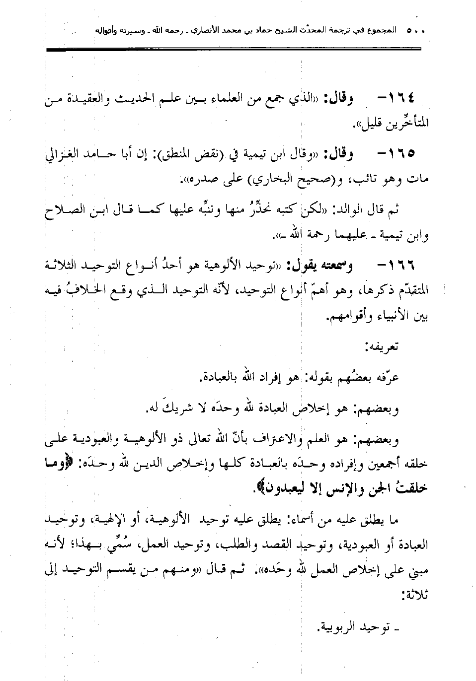 166 - وسمعته يقول: "توحيد الألوهية هو أحدُ أنواع التوحيد الثلاثة المتقدّم ذكرها، وهو أهمّ أنواع التوحيد، لأنّه التوحيد الذي وقع الخلافُ فيه بين الأنبياء وأقوامهم.