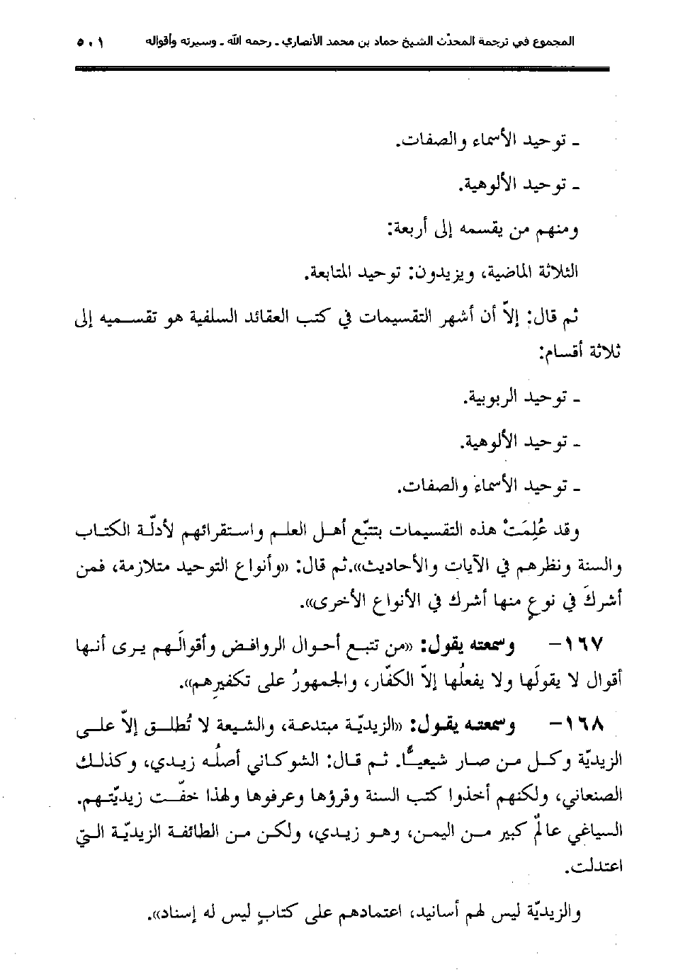 165 - وسمعته يقول: "الزيديّة مبتدعة، والشيعة لا تُطلق إلاّ على الزيديّة وكل من صار شيعيًّا. ثم قال: الشوكاني أصلُه زيدي، وكذلك الصنعاني، ولكنهم أخذوا كتب السنة وقرؤها وعرفوها ولهذا خفّت زيديّتهم. السياغي عالمٌ كبير من اليمن، وهو زيدي، ولكن من الطائفة الزيديّة التي اعتدلت.