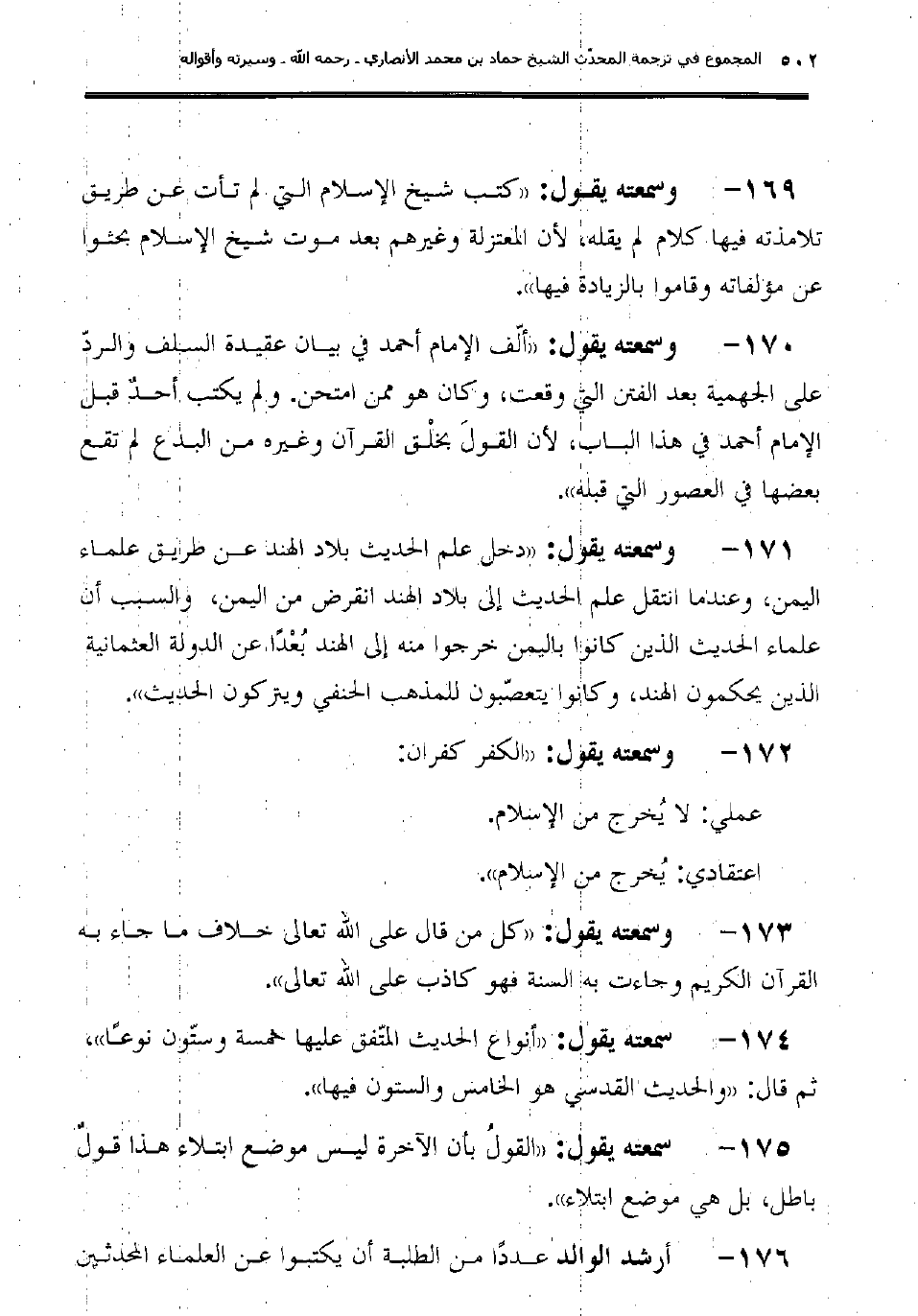 169 - وسمعته يقول: "كتب شيخ الإسلام التي لم تأت عن طريق تلامذته فيها كلام لم يقله، لأن المعتزلة وغيرهم بعد موت شيخ الإسلام بحثوا عن مؤلفاته وقاموا بالزيادة فيها".