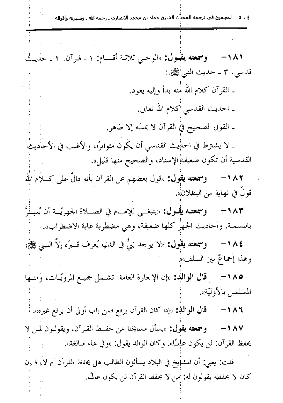 187 - وسمعته يقول: "يسأل مشايخنا عن حفظ القرآن، ويقولون لمن لا يحفظ القرآن: لن يكون عالمًا". وكان الوالد يقول: "وفي هذا مبالغة".