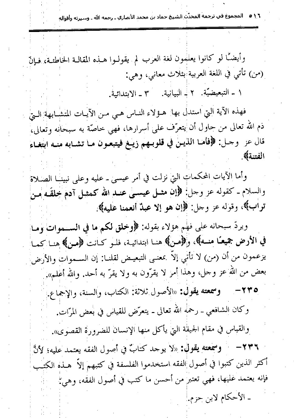236 - وسمعته يقول: "لا يوجد كتابٌ في أصول الفقه يعتمد عليه؛ لأنَّ أكثر الذين كتبوا في أصول الفقه استخدموا الفلسفة في كتبهم إلاّ هذه الكتب فإنه يعتمد عليها، فهي تعتبر من أحسن ما كتب في أصول الفقه، وهي: