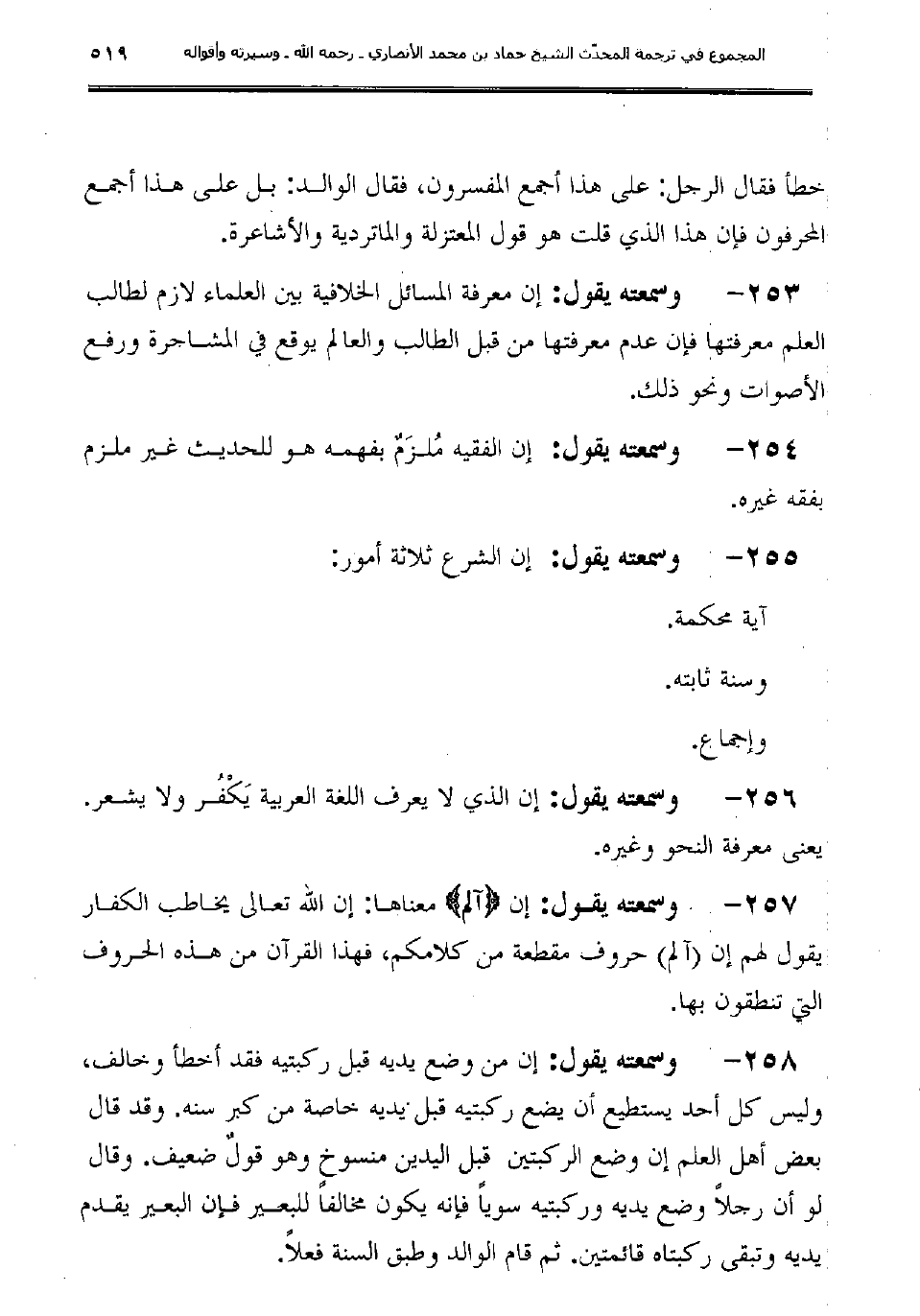 253 - وسمعته يقول: "إن معرفة المسائل الخلافية بين العلماء لازم لطالب العلم معرفتها فإن عدم معرفتها من قبل الطالب والعالم يوقع في المشاجرة ورفع الأصوات ونحو ذلك".