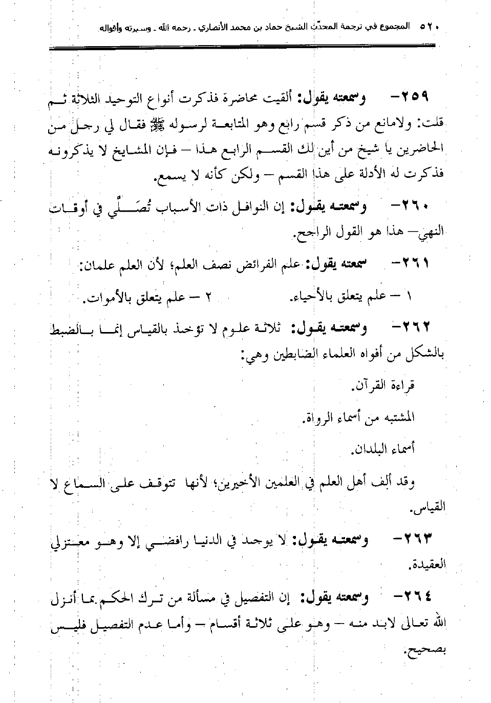 259 - وسمعته يقول: "ألقيت محاضرة فذكرت أنواع التوحيد الثلاثة ثم قلت: ولامانع من ذكر قسم رابع وهو المتابعة لرسوله صلى الله عليه وسلم فقال لي رجل من الحاضرين يا شيخ من أين لك القسم الرابع هذا -فإن المشائخ لا يذكرونه فذكرت له الأدلة على هذا القسم- ولكن كأنه لا يسمع.