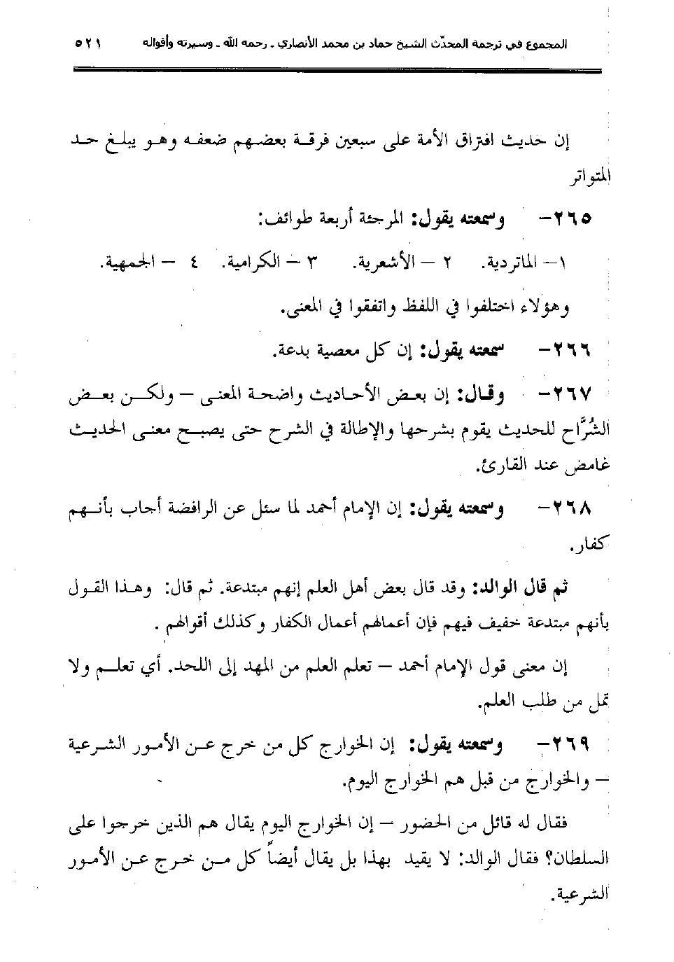 268 - وسمعته يقول: "إن الإمام أحمد لما سئل عن الرافضة أجاب بأنهم كفار".