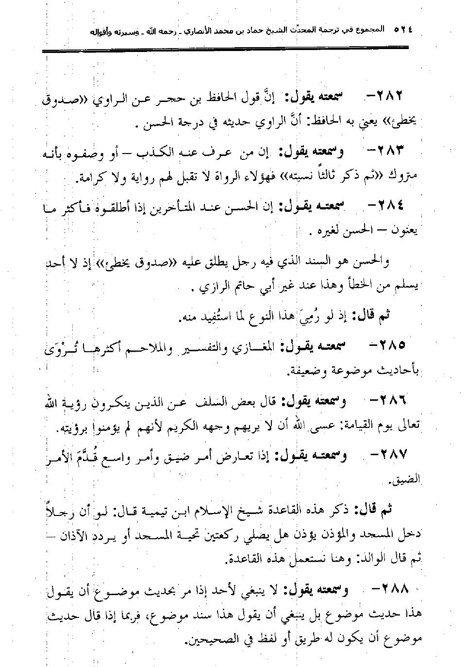 283 - وسمعته يقول: "إن من عرف عنه الكذب – أو وصفوه بأنه متروك "ثم ذكر ثالثاً نسيته" فهؤلاء الرواة لا تقبل لهم رواية ولا كرامة".