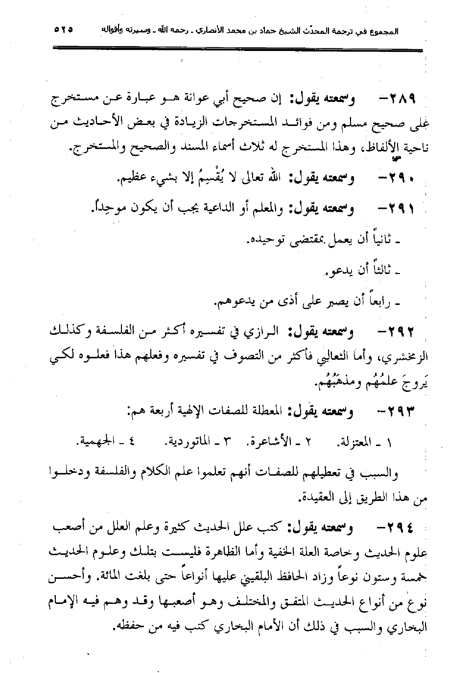 292 - وسمعته يقول: "الرازي في تفسيره أكثر من الفلسفة وكذلك الزمخشري، وأما الثعالبي فأكثر من التصوف في تفسيره وفعلهم هذا فعلوه لكي يَروجَ علمُهُم ومذهَبُهُم".