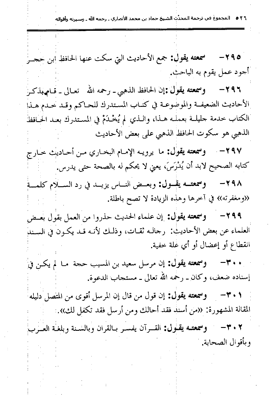 299 - وسمعته يقول: "إن علماء الحديث حذروا من العمل بقول بعض العلماء عن بعض الأحاديث: رجاله ثقات، وذلك لأنه قد يكون في السند انقطاع أو إعضال أو أي علة خفية".