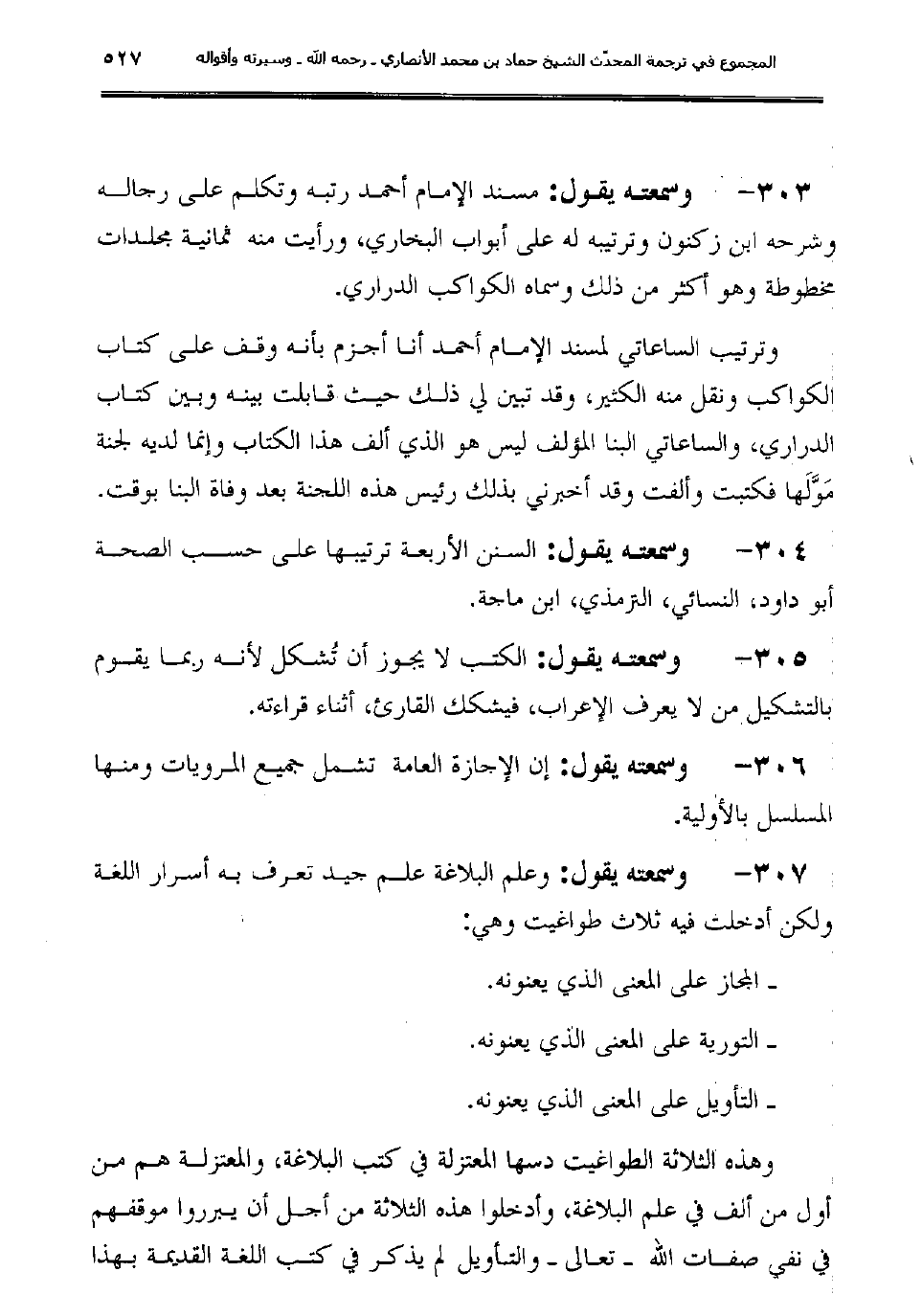 303 - وسمعته يقول: "مسند الإمام أحمد رتبه وتكلم على رجاله وشرحه ابن زكنون وترتيبه له على أبواب البخاري، ورأيت منه ثمانية مجلدات مخطوطة وهو أكثر من ذلك وسماه الكواكب الدراري".