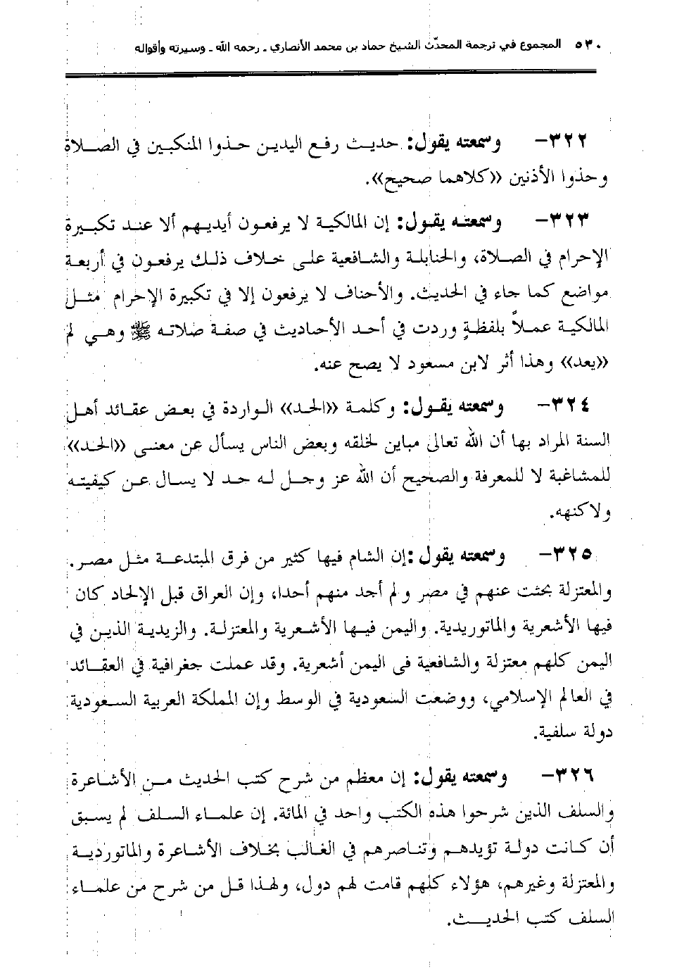 325 - وسمعته يقول: "إن الشام فيها كثير من فرق المبتدعة مثل مصر. والمعتزلة بحثت عنهم في مصر ولم أجد منهم أحدًا، وإن العراق قبل الإلحاد كان فيها الأشعرية والماتوريدية. واليمن فيها الأشعرية والمعتزلة. والزيدية الذين في اليمن كلهم معتزلة والشافعية فى اليمن أشعرية. وقد عملت جغرافية في العقائد في العالم الإسلامي، ووضعت السعودية في الوسط وإن المملكة العربية السعودية دولة سلفية".