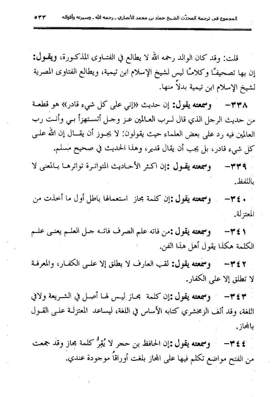 344 - وسمعته يقول: "إن الحافظ بن حجر لا يُقِرُّ كلمة مجاز وقد جمعت من الفتح مواضع تكلم فيها على المجاز بلغت أوراقاً موجودة عندي".