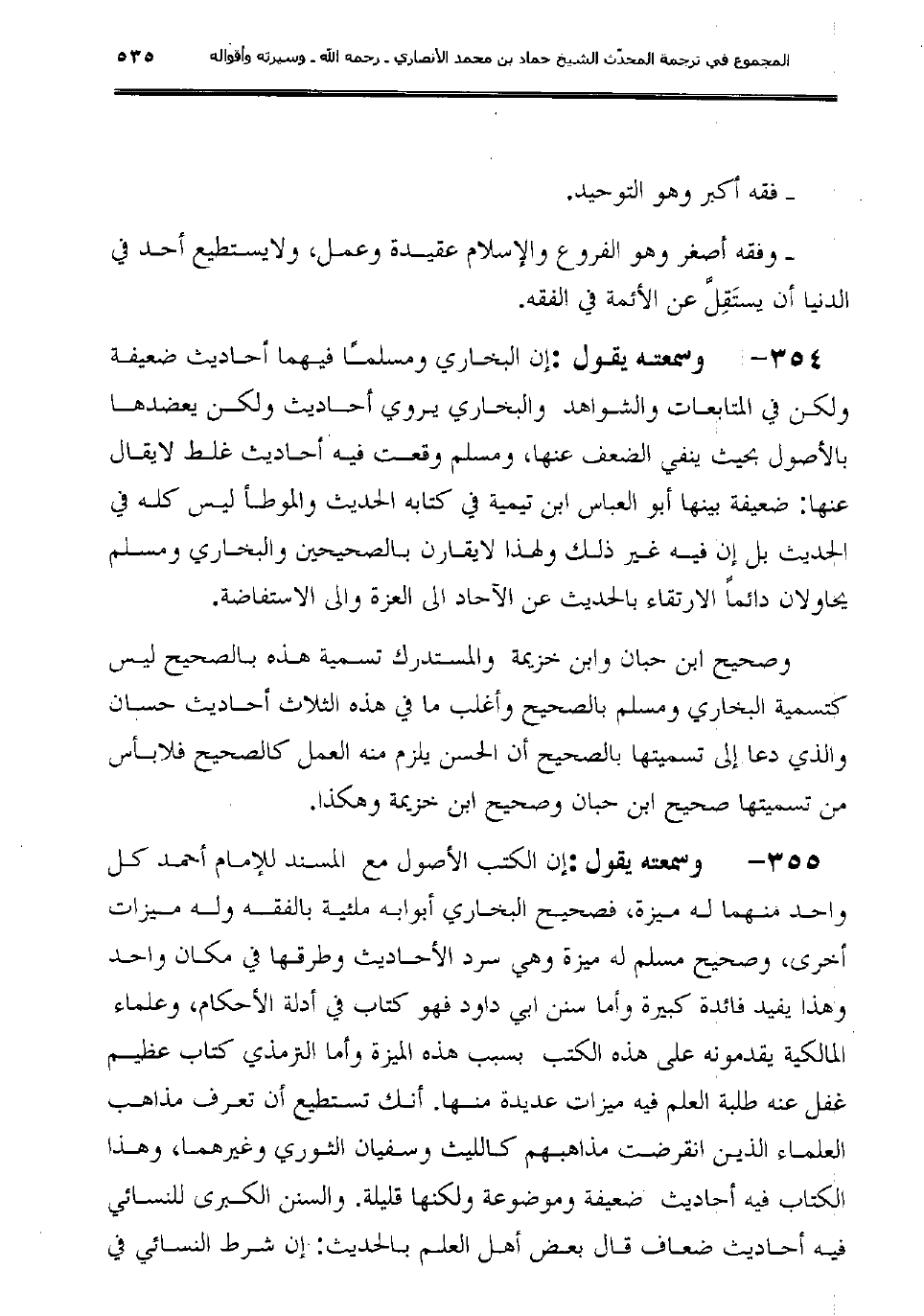 وسمعته يقول: "إن الكتب الأصول مع المسند للإمام أحمد كل واحد منهما له ميزة، فصحيح البخاري أبوابه ملئية بالفقه وله ميزات أخرى، وصحيح مسلم له ميزة وهي سرد الأحاديث وطرقها في مكان واحد وهذا يفيد فائدة كبيرة وأما سنن ابي داود فهو كتاب في أدلة الأحكام، وعلماء المالكية يقدمونه على هذه الكتب بسبب هذه الميزة وأما الترمذي كتاب عظيم غفل عنه طلبة العلم فيه ميزات عديدة منها. أنك تستطيع أن تعرف مذاهب العلماء الذين انقرضت مذاهبهم كالليث وسفيان الثوري وغيرهما، وهذا الكتاب فيه أحاديث ضعيفة وموضوعة ولكنها قليلة. والسنن الكبرى للنسائي فيه أحاديث ضعاف قال بعض أهل العلم بالحديث: إن شرط النسائي في