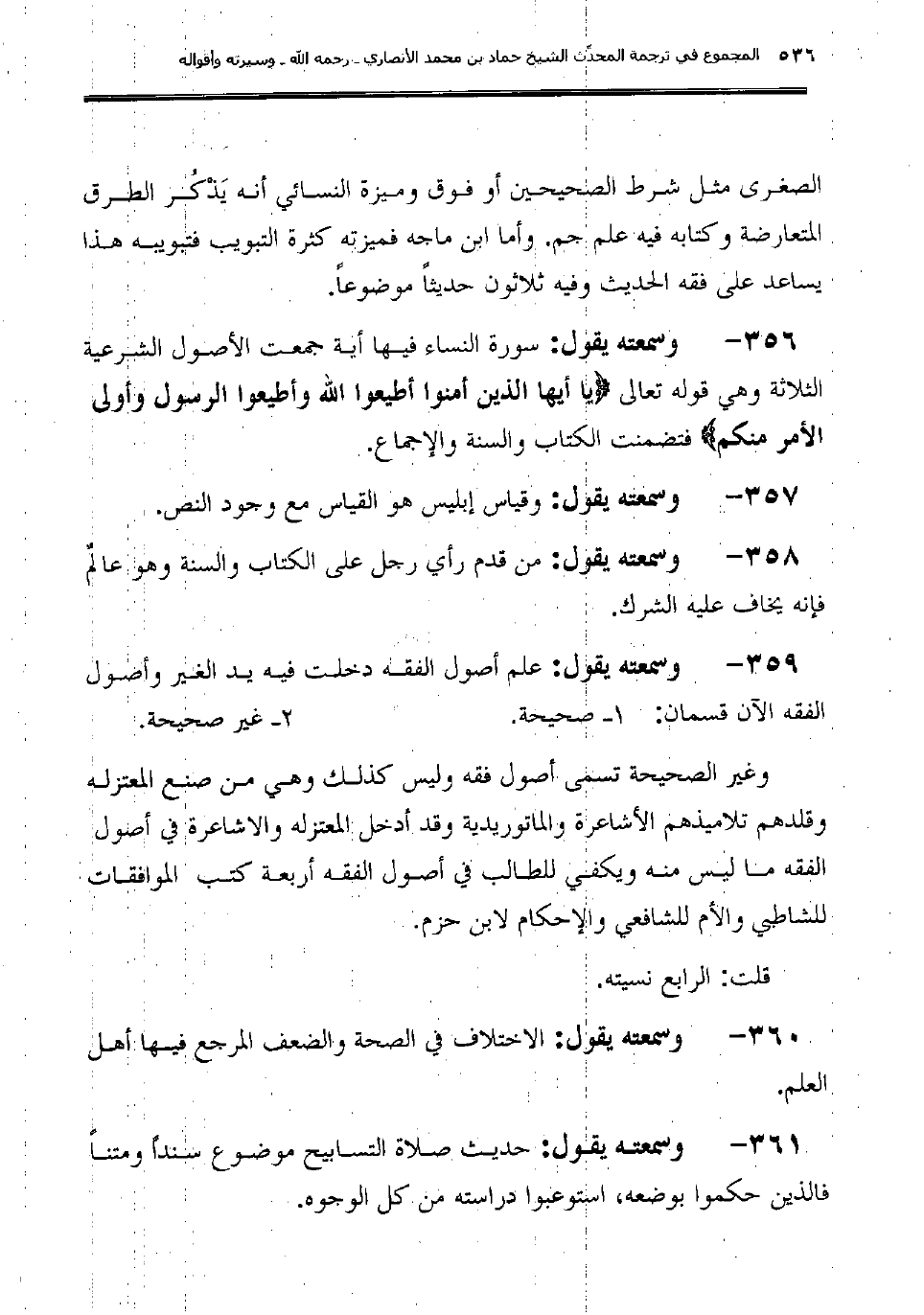 356 - وسمعته يقول: "سورة النساء فيها أية جمعت الأصول الشرعية الثلاثة وهي قوله تعالى {يا أيها الذين أمنوا أطيعوا الله وأطيعوا الرسول وأولى الأمر منكم} فتضمنت الكتاب والسنة والإجماع".