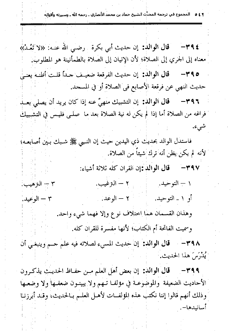398 - قال الوالد: "إن حديث المسيء لصلاته فيه علم جم وينبغي أن يُدْرَسَ هذا الحديث".