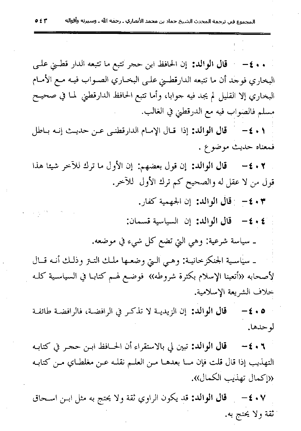 400 - قال الوالد: "إن الحافظ ابن حجر تتبع ما تتبعه الدارقطني على البخاري فوجد أنَّ ما تتبعه الدارقطني على البخاري الصواب فيه مع الأمام البخاري إلا القليل لم يجد فيه جواباً، وأما تتبع الحافظ الدارقطني لما في صحيح مسلم فالصواب فيه مع الدرقطني في الغالب".