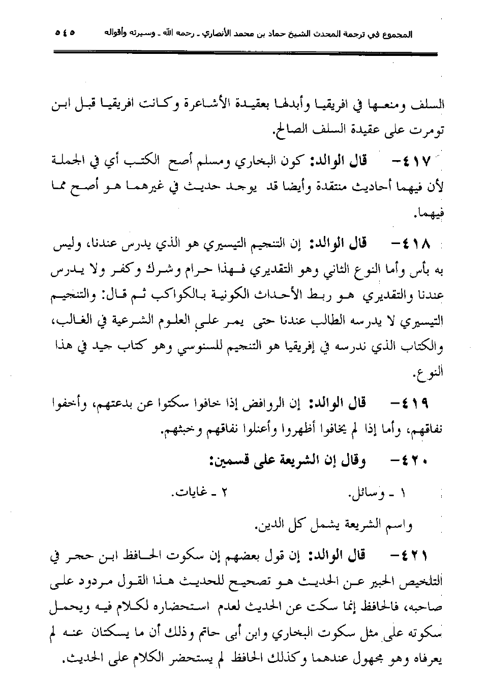 418 - قال الوالد: "إن التنجيم التيسيري هو الذي يُدَرَّسُ عندنا، وليس به بأس وأما النوع الثاني وهو التقديري فهذا حرام وشرك وكفر ولا يُدَرَّسُ عندنا والتقديري هو ربط الأحداث الكونية بالكواكب ثم قال: والتنجيم التيسيري لا يدرسه الطالب عندنا حتى يَمُرَّ على العلوم الشرعية في الغالب، والكتاب الذي ندرسه في إفريقيا هو التنجيم للسنوسي وهو كتاب جيد في هذا النوع".