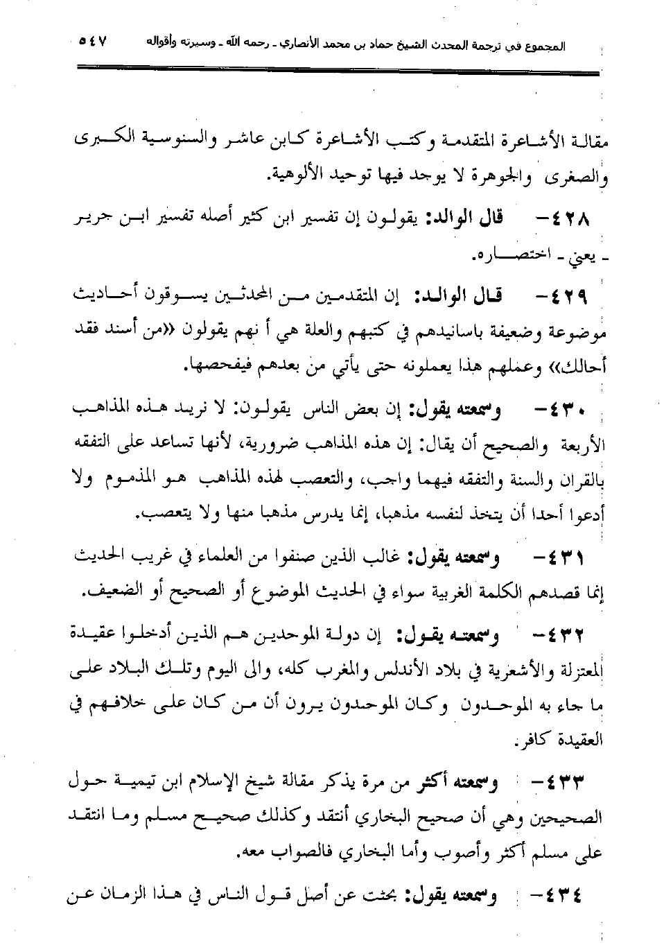 430 - وسمعته يقول: "إن بعض الناس يقولون: لا نريد هذه المذاهب الأربعة والصحيح أن يقال: إن هذه المذاهب ضرورية، لأنها تساعد على التفقه بالقران والسنة والتفقه فيهما واجب، والتعصب لهذه المذاهب هو المذموم ولا أدعوا أحداً أن يتخذ لنفسه مذهباً، إنما يَدْرُسُ مذهباً منها ولا يتعصب".