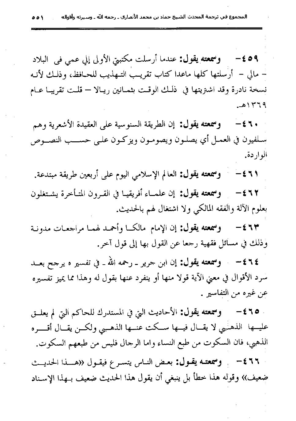 464 - وسمعته يقول: "إن ابن جرير -رحمه الله- في تفسير هـ يرجح بعد سرد الأقوال في معني الآية قولاً منها أو ينفرد عنها بقول له وهذا مما يميز تفسيره عن غيره من التفاسير".