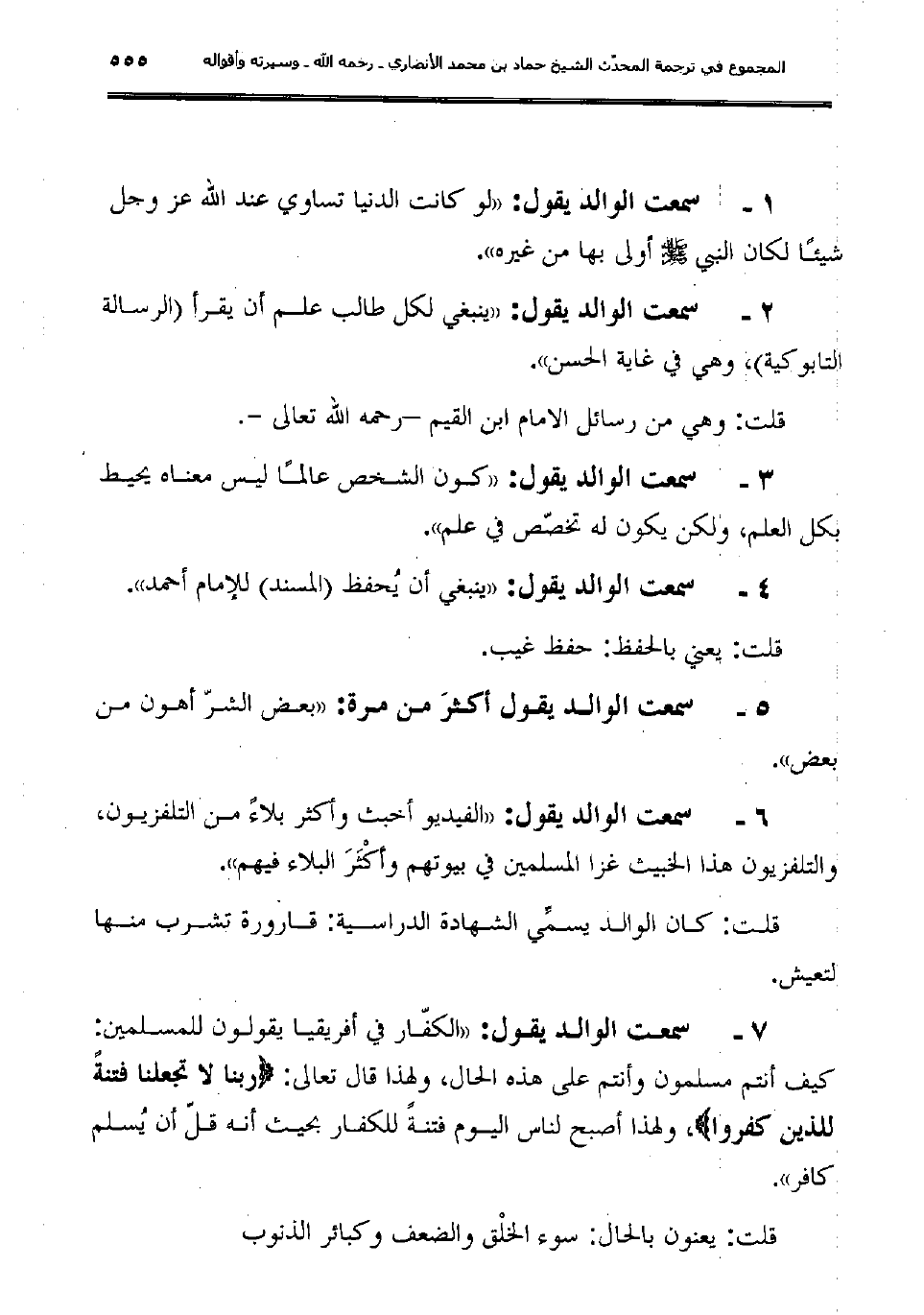 6ـ سمعت الوالد يقول: "الفيديو أخبث وأكثر بلاءً من التلفزيون، والتلفزيون هذا الخبيث غزا المسلمين في بيوتهم وأَكْثَرَ البلاء فيهم".