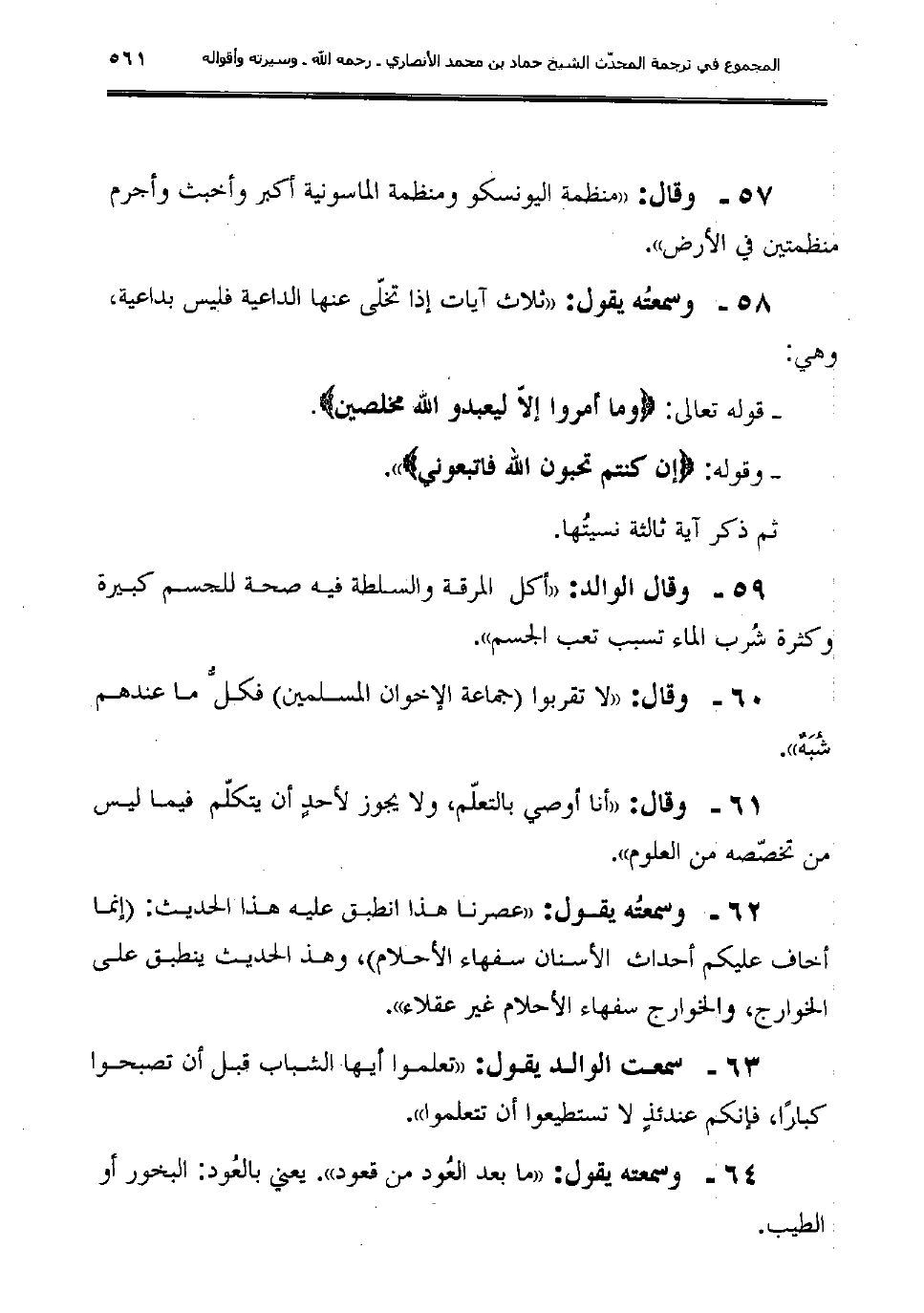 60 ـ وقال: "لا تقربوا (جماعة الإخوان المسلمين) فكلُّ ما عندهم شُبَهٌ".