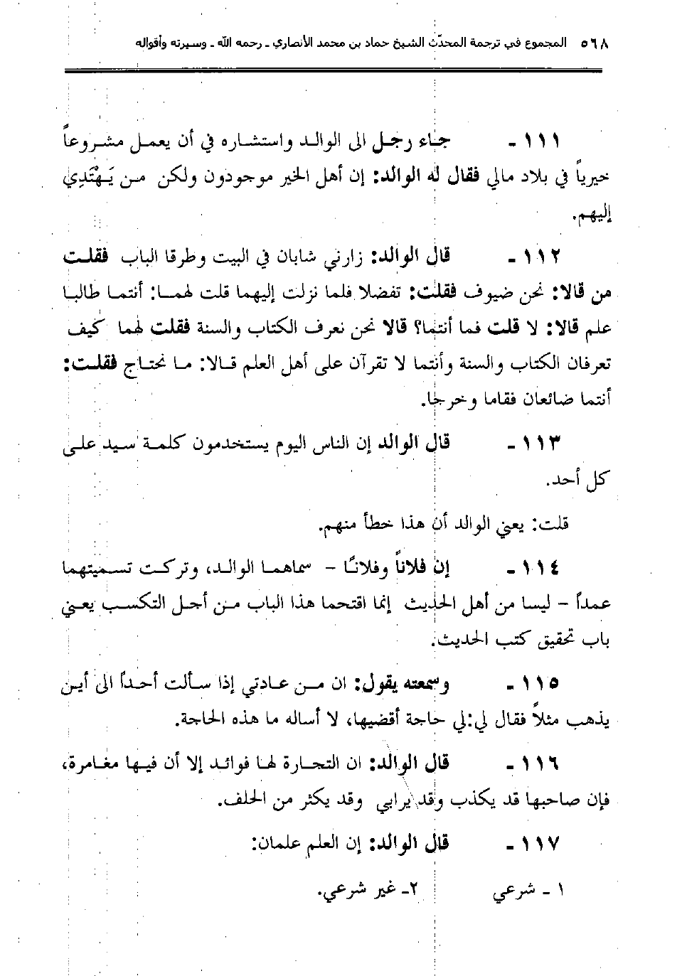 112ـ قال الوالد: زارني شابان في البيت وطرقا الباب فقلت من قالا: نحن ضيوف فقلت: تفضلا فلما نزلت إليهما قلت لهما: أنتما طالبا علم قالا: لا قلت فما أنتما؟ قالا نحن نعرف الكتاب والسنة فقلت لهما كيف تعرفان الكتاب والسنة وأنتما لا تقرآن على أهل العلم قالا: ما نحتاج فقلت: أنتما ضائعان فقاما وخرجا.