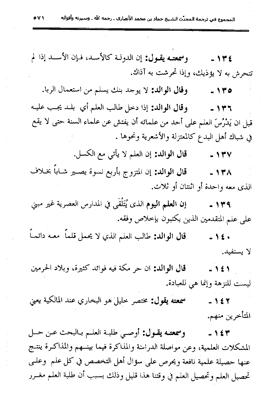 136 ـ وقال الوالد: "إذا دخل طالب العلم أي بلد يجب عليه قبل ان يَدْرُسَ العلم على أحد من علمائه أن يفتش عن علماء السنة حتى لا يقع في شباك أهل البدع كالمعتزلة والأشعرية ونحوها".