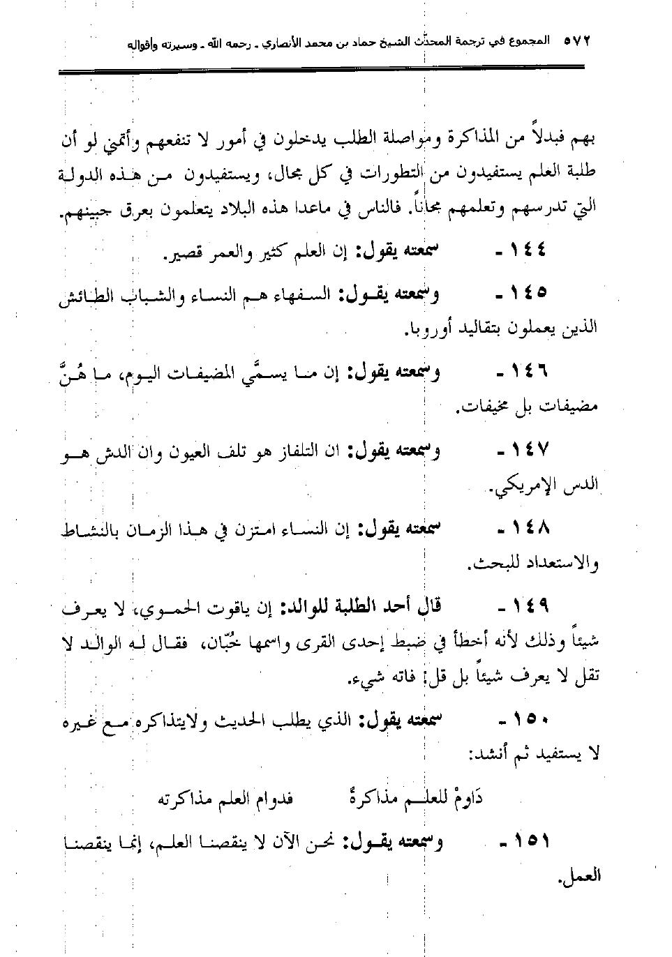 150 ـ سمعته يقول: "الذي يطلب الحديث ولايتذاكره مع غيره لا يستفيد ثم أنشد: