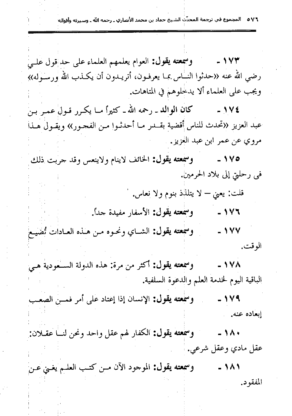 173ـ وسمعته يقول: "العوام يعلمهم العلماء على حد قول علي رضي الله عنه "حدثوا الناس بما يعرفون، أتريدون أن يكذب الله ورسوله" ويجب على العلماء ألا يدخلوهم في المتاهات".