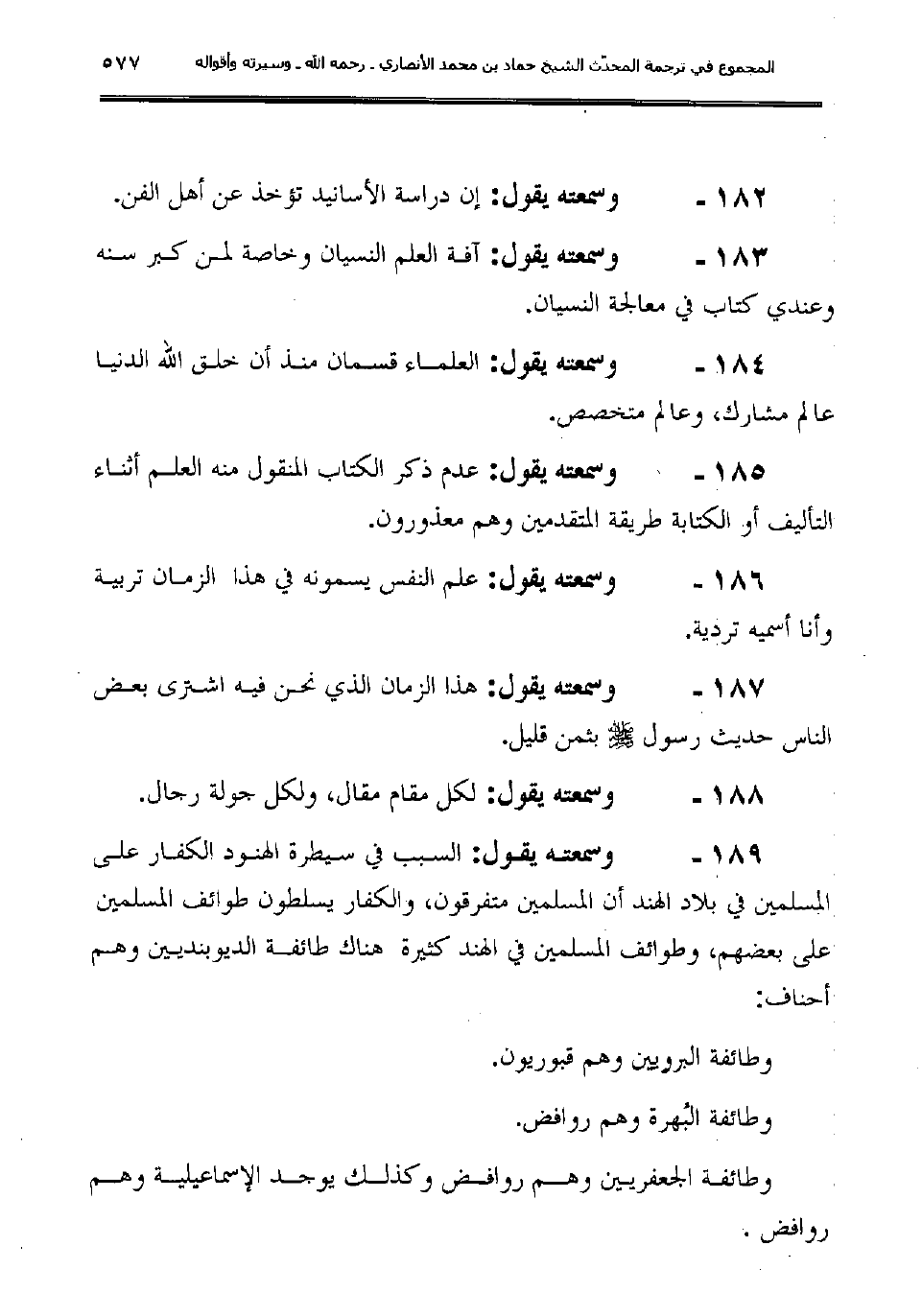 189ـ وسمعته يقول: "السبب في سيطرة الهنود الكفار على المسلمين في بلاد الهند أن المسلمين متفرقون، والكفار يسلطون طوائف المسلمين على بعضهم، وطوائف المسلمين في الهند كثيرة هناك طائفة الديوبنديين وهم أحناف: