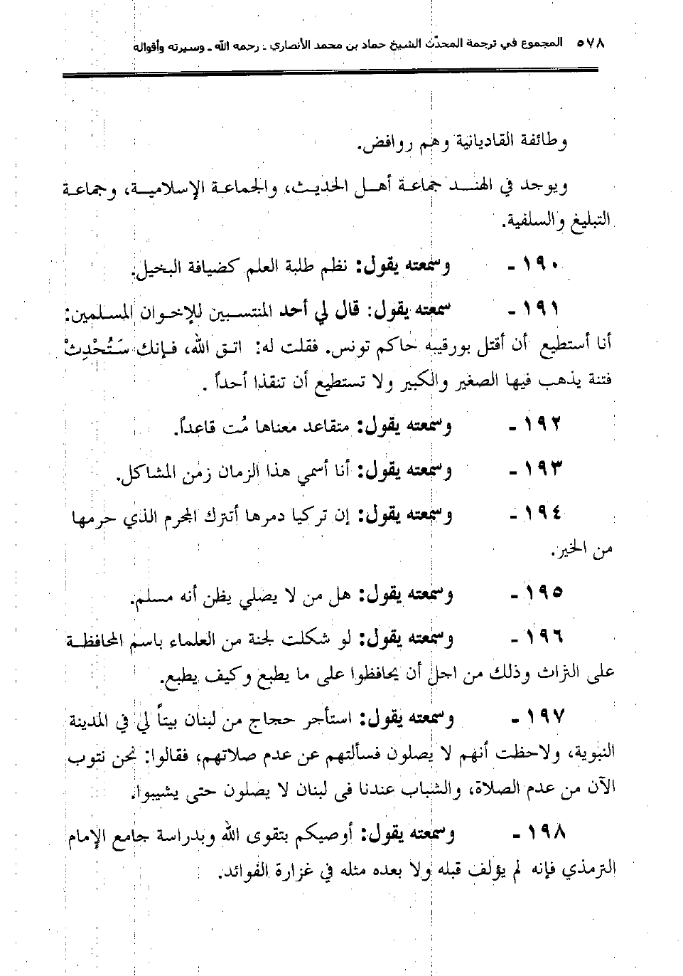 198ـ وسمعته يقول: "أوصيكم بتقوى الله وبدراسة جامع الإمام الترمذي فإنه لم يؤلف قبله ولا بعده مثله في غزارة الفوائد".