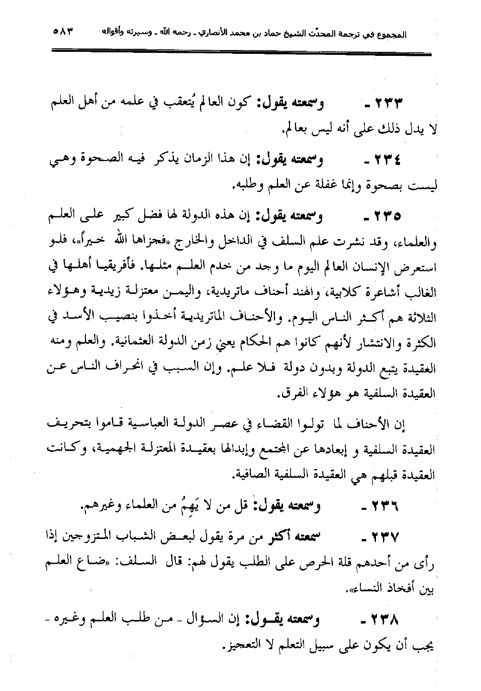 235ـ وسمعته يقول: "إن هذه الدولة لها فضل كبير على العلم والعلماء، وقد نشرت علم السلف في الداخل والخارج (فجزاها الله خيراً) ، فلو استعرض الإنسان العالم اليوم ما وجد من خدم العلم مثلها. فأفريقيا أهلها في الغالب أشاعرة كلابية، والهند أحناف ماتريدية، واليمن معتزلة زيدية وهؤلاء الثلاثة هم أكثر الناس اليوم. والأحناف الماتريدية أخذوا بنصيب الأسد في الكثرة والانتشار لأنهم كانوا هم الحكام يعني زمن الدولة العثمانية. والعلم ومنه العقيدة يتبع الدولة وبدون دولة فلا علم. وإن السبب في انحراف الناس عن العقيدة السلفية هو هؤلاء الفرق.