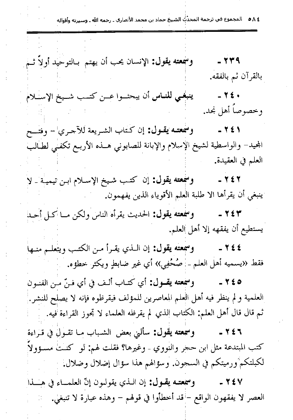 242ـ وسمعته يقول: "إن كتب شيخ الإسلام ابن تيمية: لا ينبغي أن يقرأها الا طلبة العلم الأقوياء الذين يفهمون".