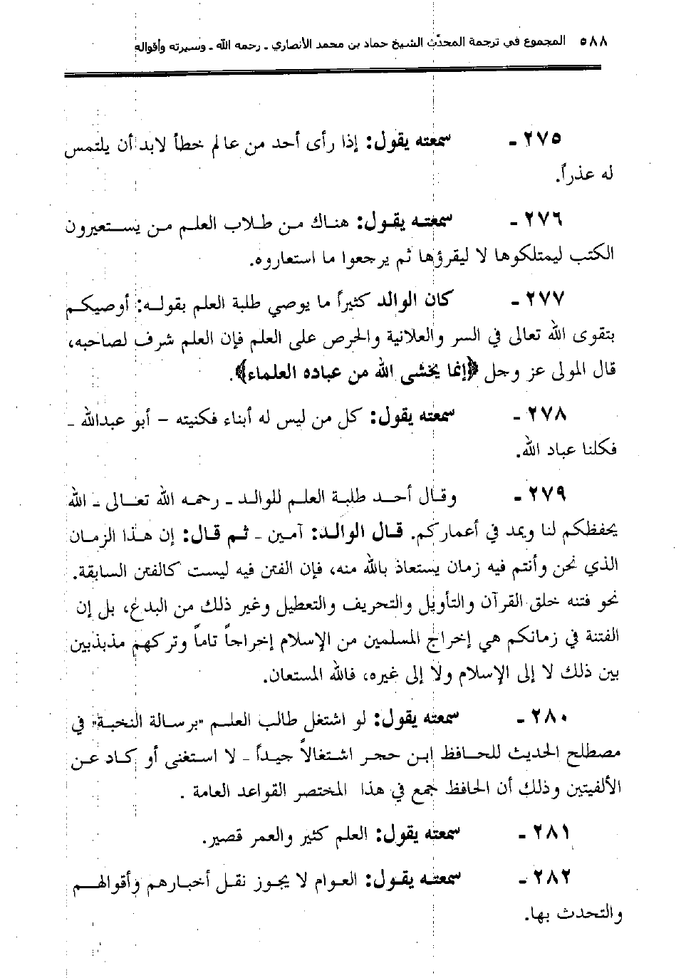 280ـ سمعته يقول: "لو اشتغل طالب العلم "برسالة النخبة" في مصطلح الحديث للحافظ ابن حجر اشتغالاً جيداً – لا استغنى أو كاد عن الألفيتين وذلك أن الحافظ جمع في هذا المختصر القواعد العامة ".