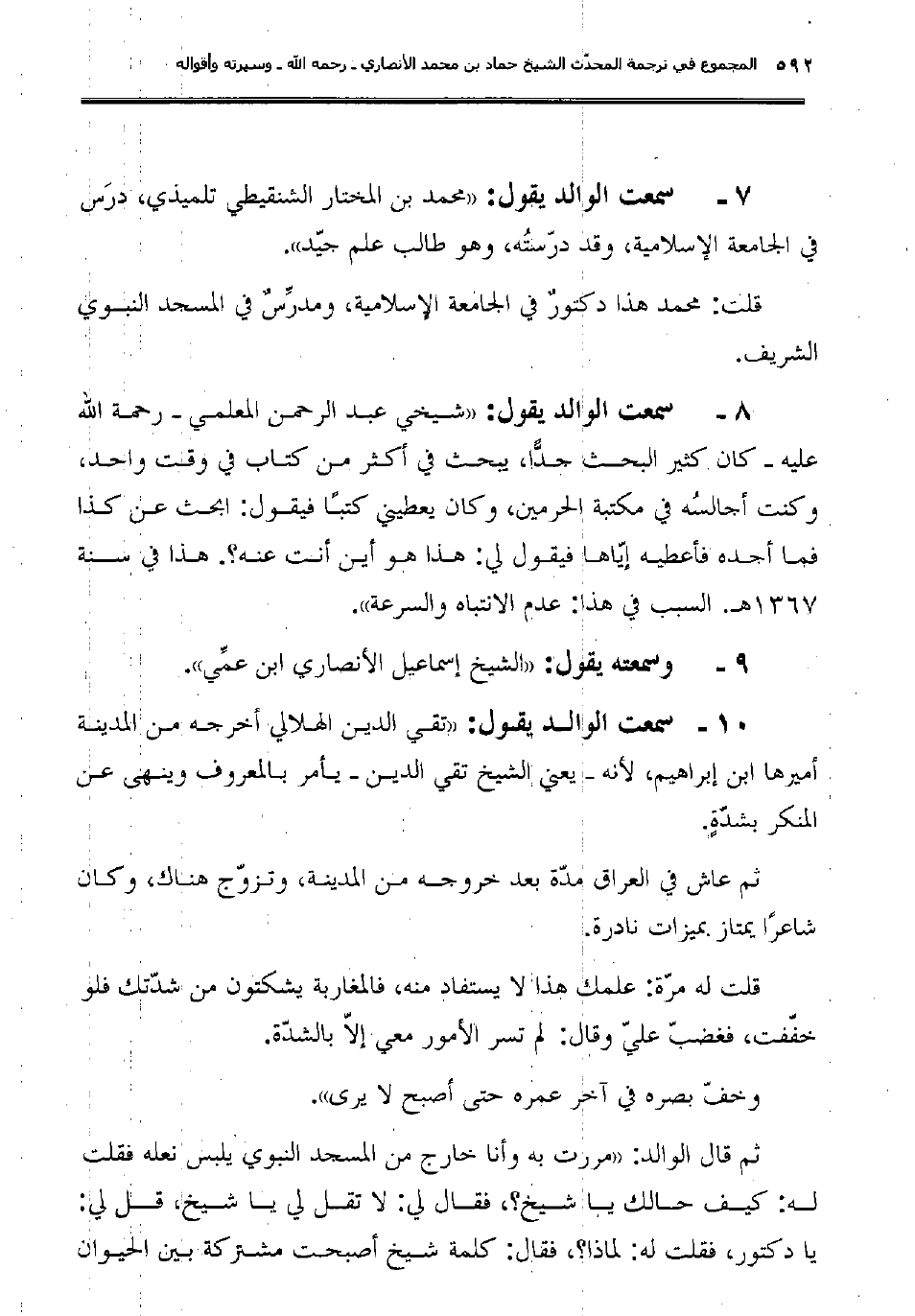 7ـ سمعت الوالد يقول: "محمد بن المختار الشنقيطي تلميذي، درَس في الجامعة الإسلامية، وقد درّستُه، وهو طالب علم جيّد".