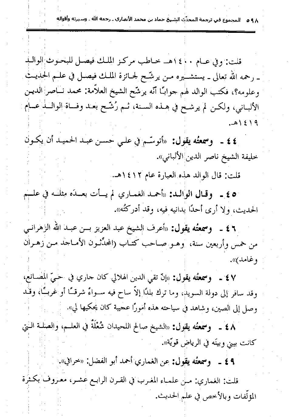 44ـ وسمعتُه يقول: "أتوسّم في علي حسن عبد الحميد أن يكون خليفة الشيخ ناصر الدين الألباني".