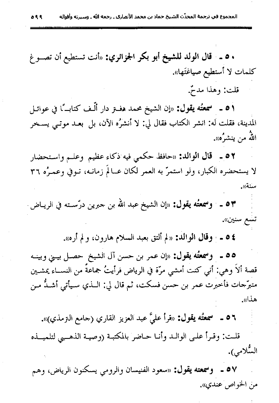 53ـ وسمعتُه يقول: "إن الشيخ عبد الله بن جبرين درّسته في الرياض تسع سنين".