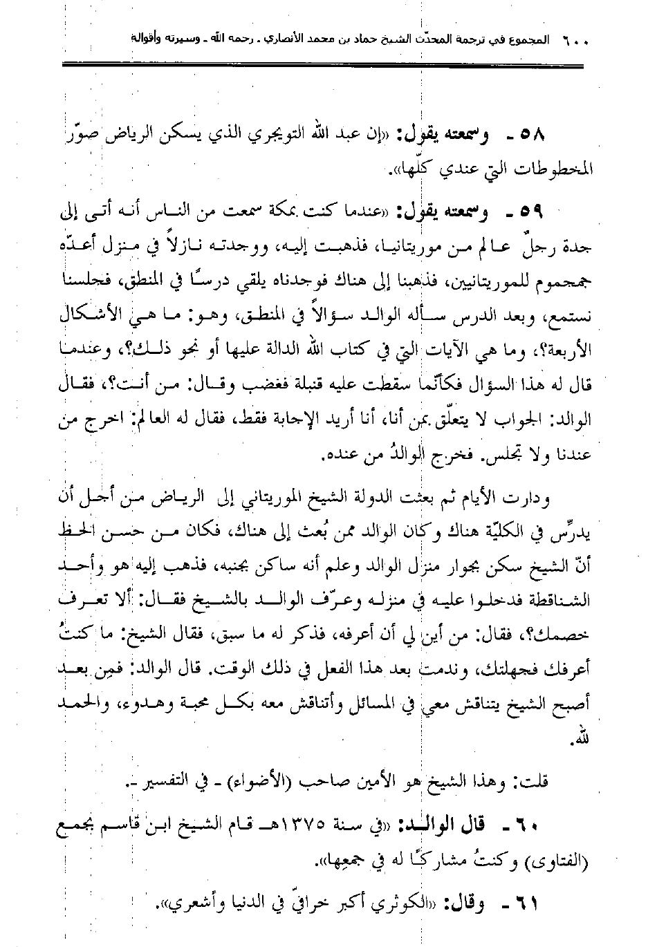 58ـ وسمعته يقول: "إن عبد الله التويجري الذي يسكن الرياض صوّر المخطوطات التي عندي كلّها".