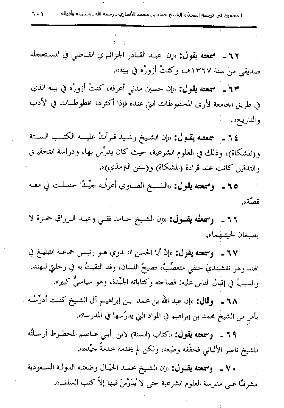 67ـ وسمعته يقول: "إنّ أبا الحسن الندوي هو رئيس جماعة التبليغ في الهند وهو نقشبنديّ حنفي متعصِّبٌ، فصيحُ اللسان، وقد التقيتُ به في رحلتي للهند. والسببُ في إقبال الناس عليه: فصاحته وكتاباته الجيِّدة، وهو سياسيٌّ كبير".