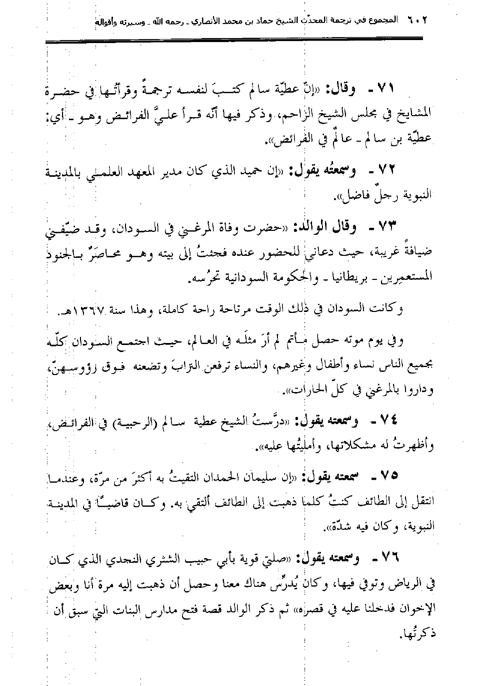 71ـ وقال: "إنّ عطيّة سالم كتبَ لنفسه ترجمةً وقرأتُها في حضرة المشايخ في مجلس الشيخ الزاحم، وذكر فيها أنّه قرأ عليَّ الفرائض وهو- أي: عطيّة بن سالم- عالمٌ في الفرائض".