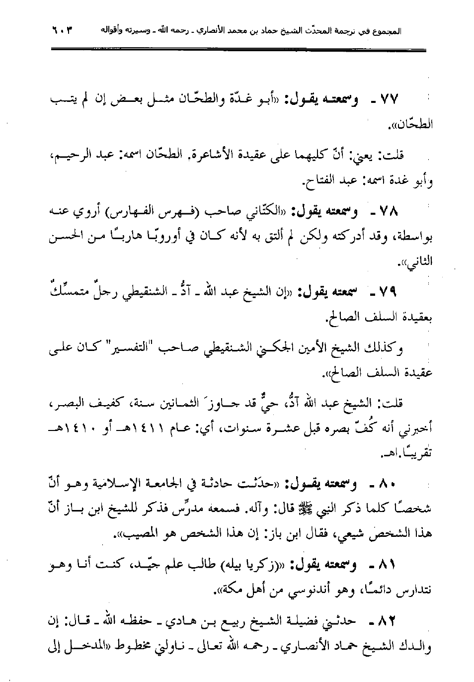 79ـ سمعته يقول: "إن الشيخ عبد الله- آدُّ- الشنقيطي رجلٌ متمسِّكٌ بعقيدة السلف الصالح.