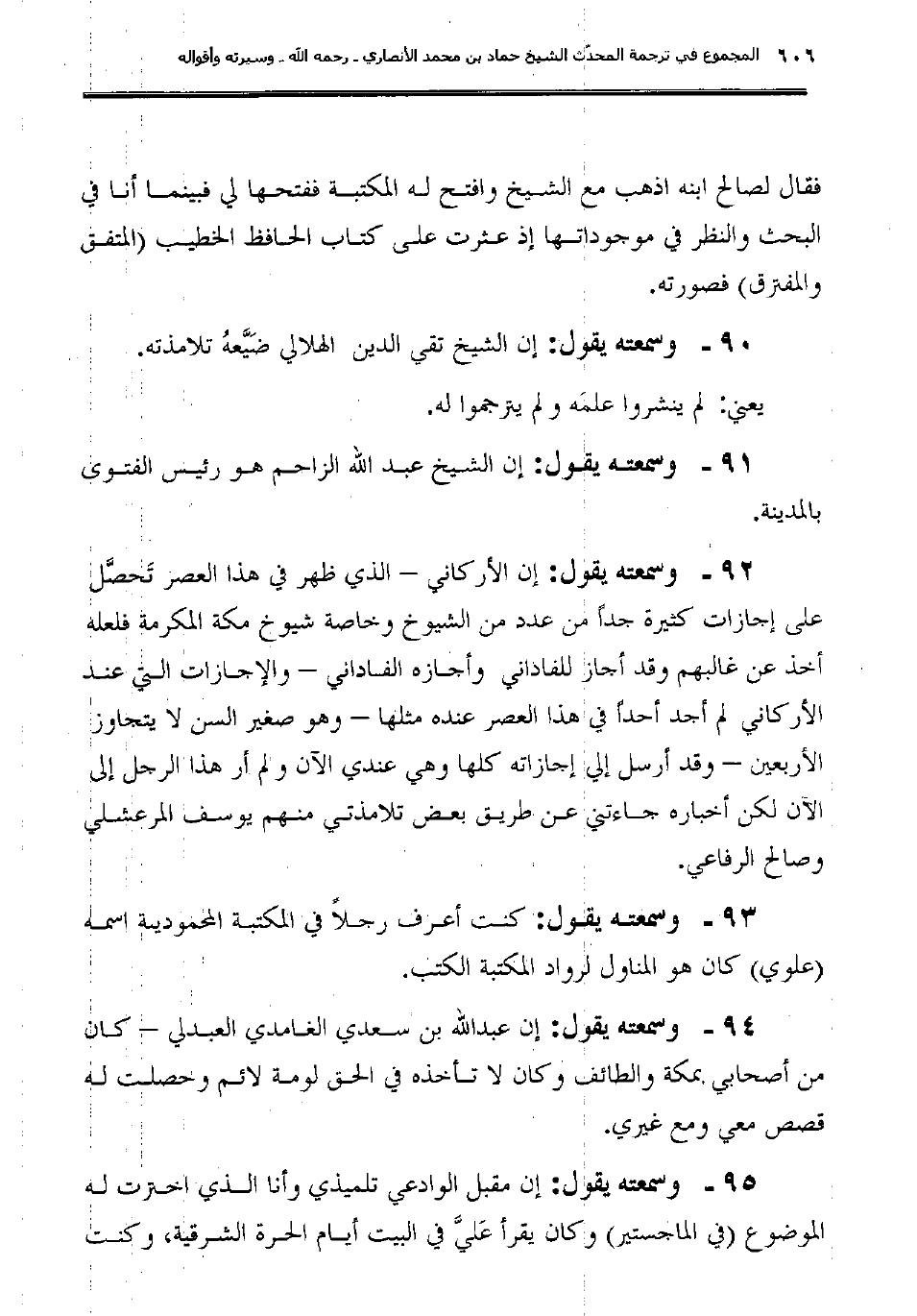 92ـ وسمعته يقول: "إن الأركاني – الذي ظهر في هذا العصر تَحصَّل على إجازات كثيرة جداً من عدد من الشيوخ وخاصة شيوخ مكة المكرمة فلعله أخذ عن غالبهم وقد أجاز للفاداني وأجازه الفاداني – والإجازات التي عند الأركاني لم أجد أحداً في هذا العصر عنده مثلها – وهو صغير السن لا يتجاوز الأربعين – وقد أرسل إلي إجازاته كلها وهي عندي الآن ولم أر هذا الرجل إلى الآن لكن أخباره جاءتني عن طريق بعض تلامذتي منهم يوسف المرعشلي وصالح الرفاعي.