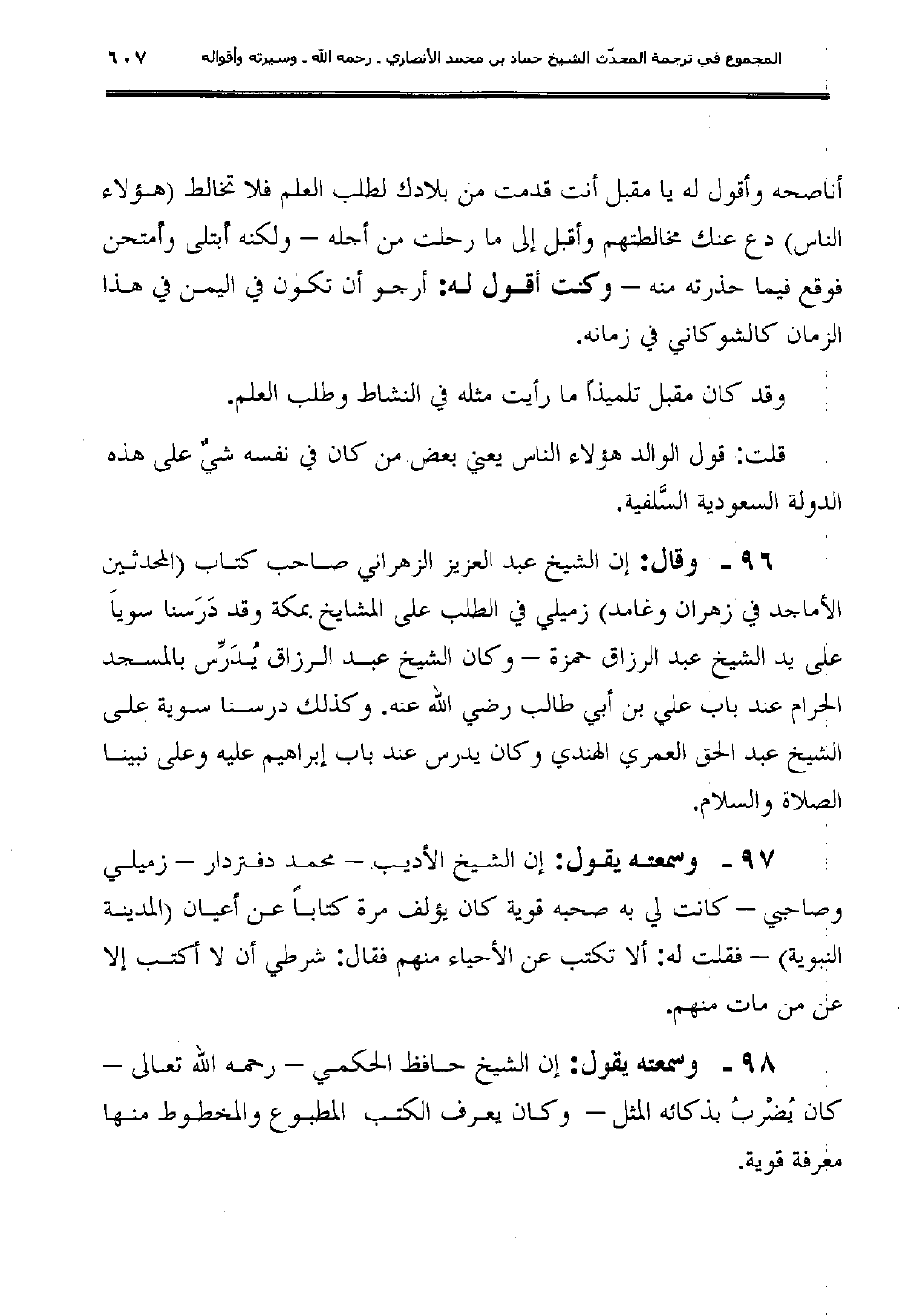97ـ وسمعته يقول: "إن الشيخ الأديب –حمد دفتردار –زميلي وصاحبي– كانت لي به صحبه قوية كان يؤلف مرة كتاباً عن أعيان (المدينة النبوية) – فقلت له: ألا تكتب عن الأحياء منهم فقال: شرطي أن لا أكتب إلا عن من مات منهم.