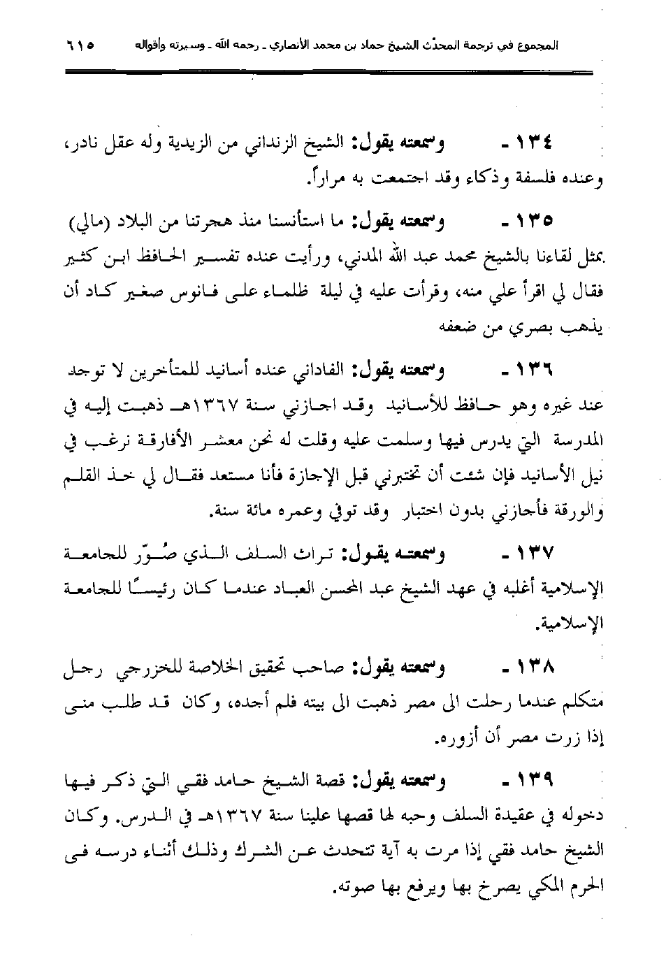 137ـ وسمعته يقول: "تراث السلف الذي صُوّر للجامعة الإسلامية أغلبه في عهد الشيخ عبد المحسن العباد عندما كان رئيسًا للجامعة الإسلامية".