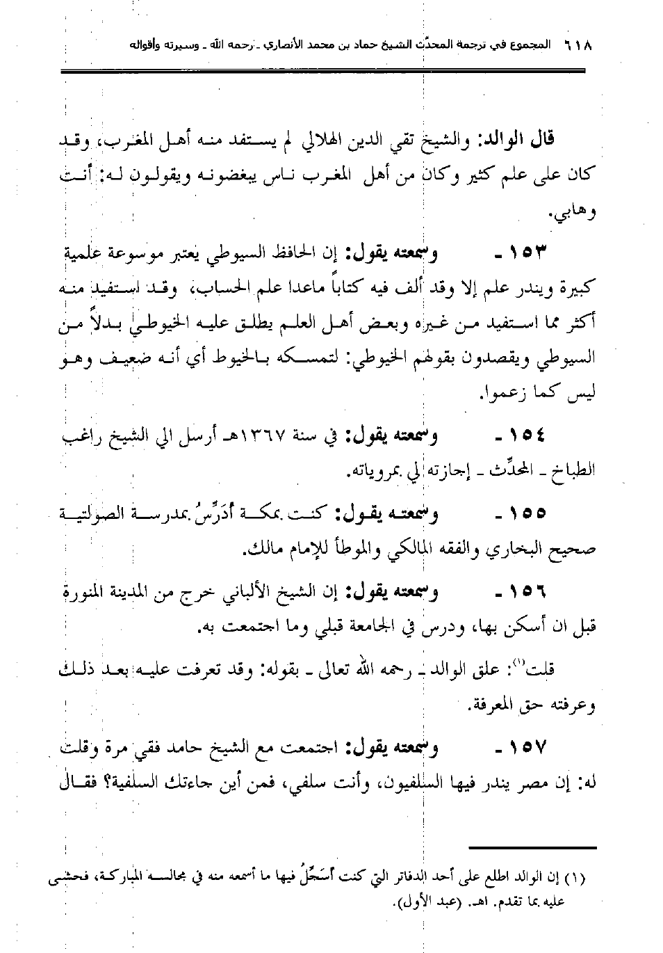156ـ وسمعته يقول: "إن الشيخ الألباني خرج من المدينة المنورة قبل ان أسكن بها، ودرس في الجامعة قبلي وما اجتمعت به".