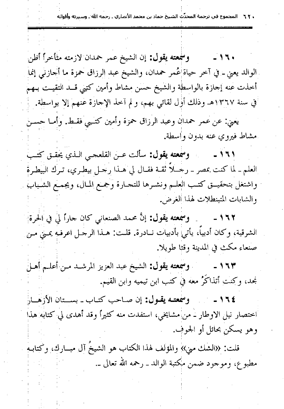 160ـ وسمعته يقول: "إن الشيخ عمر حمدان لازمته متأخراً أظن الوالد يعني- في آخر حياة عُمر حمدان، والشيخ عبد الرزاق حمزة ما أجازني إنما أخذت عنه إجازة بالواسطة والشيخ حسن مشاط وأمين كتبي قد التقيت بهم في سنة 1367هـ وذلك أول لقائي بهم، ولم آخذ الإجازة عنهم إلا بواسطة.