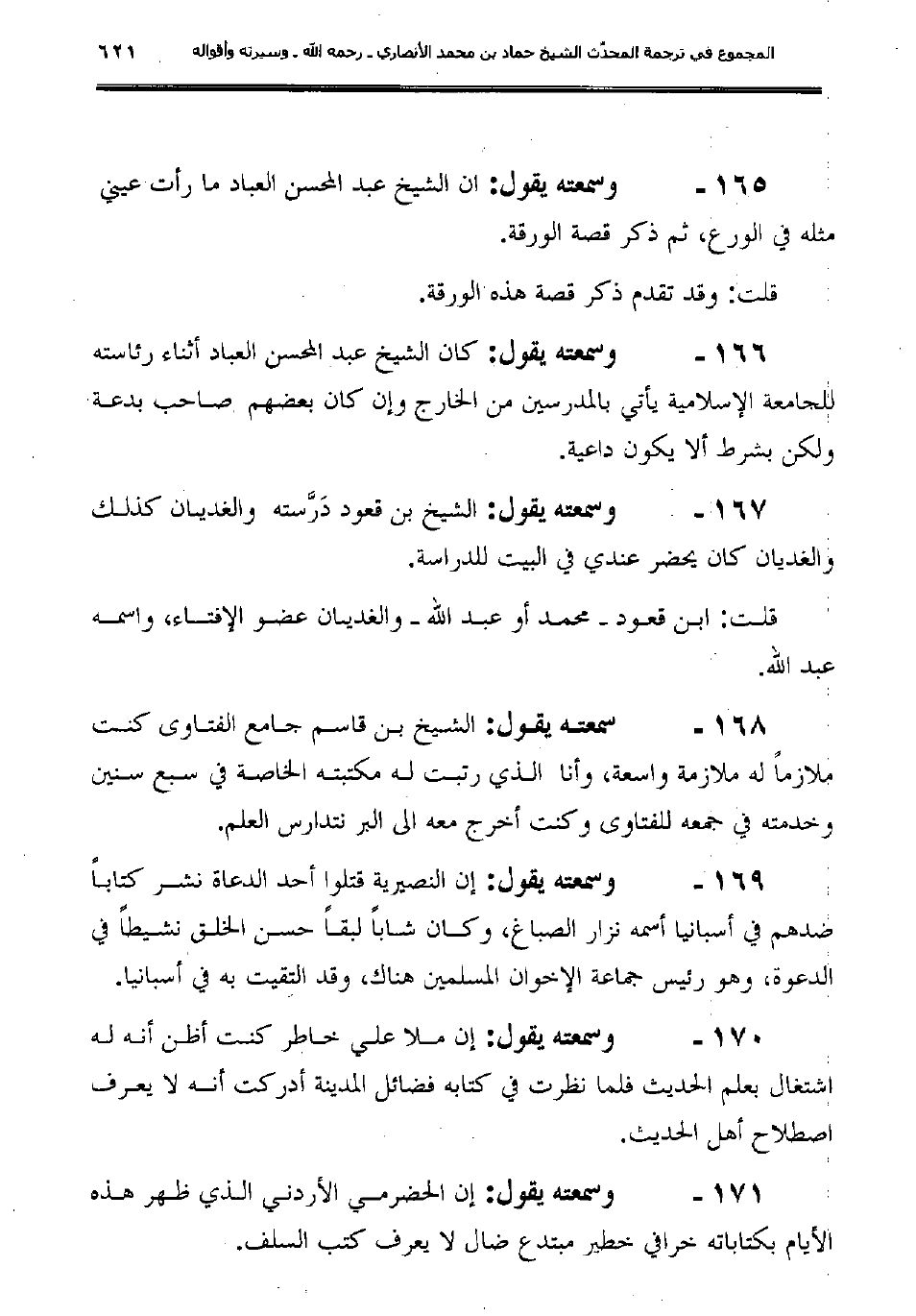 171ـ وسمعته يقول: "إن الحضرمي الأردني الذي ظهر هذه الأيام بكتاباته خرافي خطير مبتدع ضال لا يعرف كتب السلف".