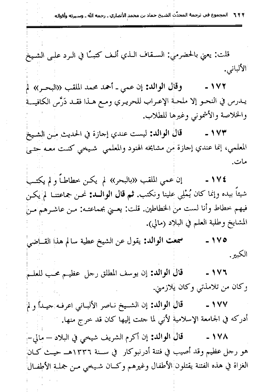 174ـ إن عمي الملقب (بالبحر) لم يكن خطاطاً ولم يكتب شيئاً بيده وإنما كان يُمْلِي علينا ونكتب. ثم قال الوالد: نحن جماعتنا لم يكن فيهم خطاط وأنا لست من الخطاطين. قلت: يعني بجماعته: من عاشرهم من المشايخ وطلبة العلم في البلاد (مالي) .
