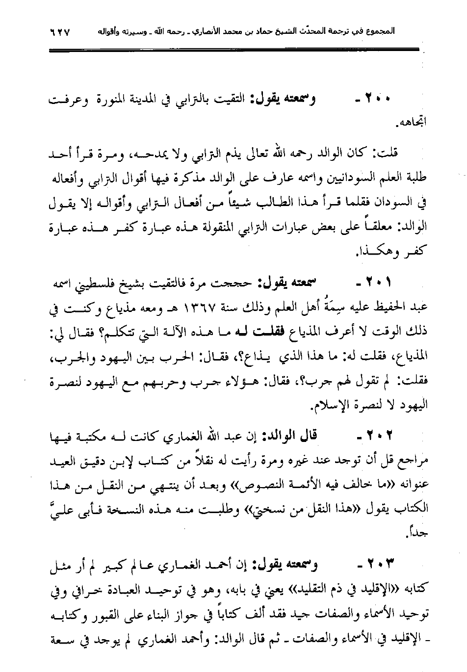202 ـ قال الوالد: "إن عبد الله الغماري كانت له مكتبة فيها مراجع قل أن توجد عند غيره ومرة رأيت له نقلاً من كتاب لإبن دقيق العيد عنوانه (ما خالف فيه الأئمة النصوص) وبعد أن ينتهي من النقل من هذا الكتاب يقول "هذا النقل من نسختي" وطلبت منه هذه النسخة فأبى عليَّ جداً.