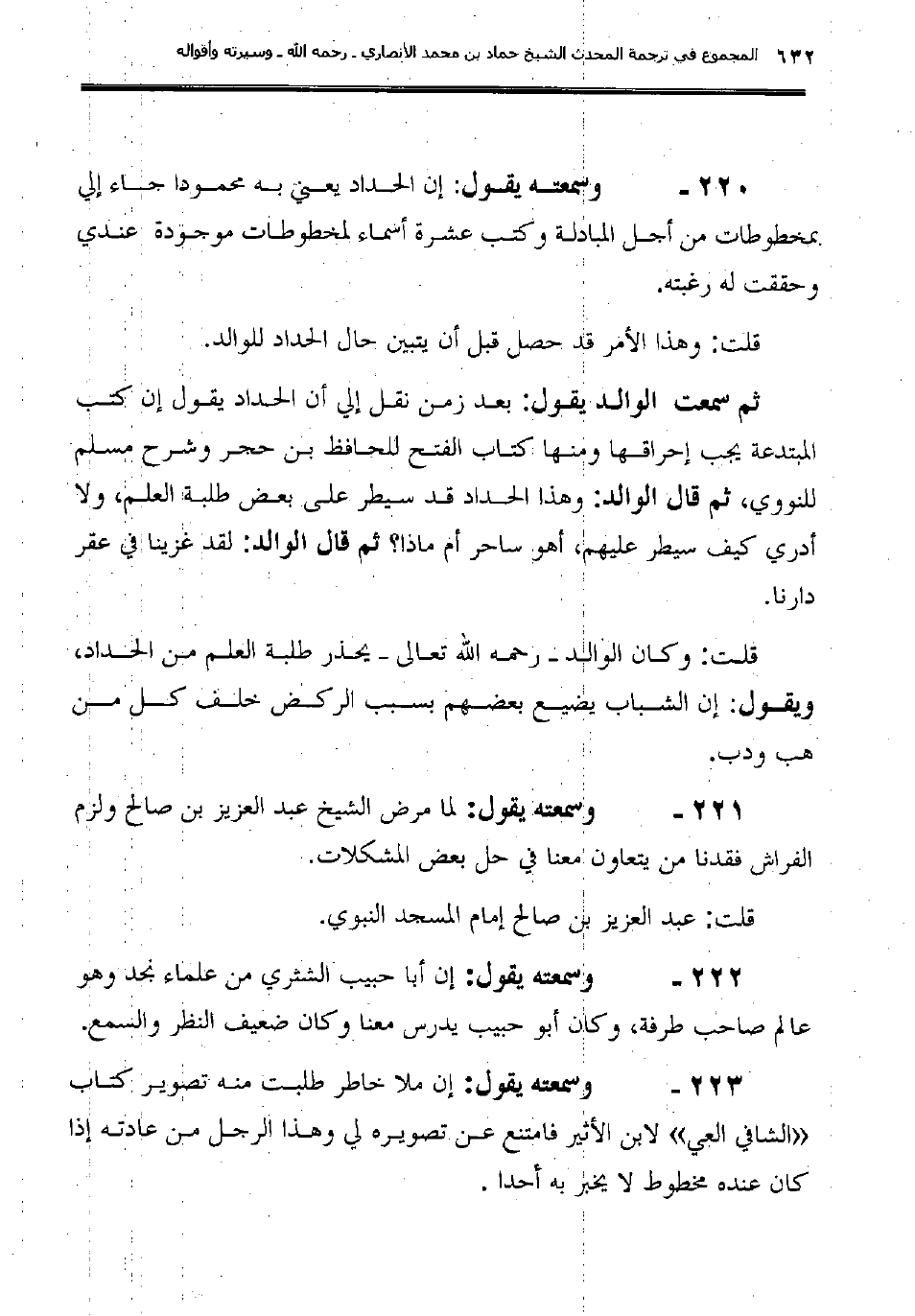222ـ وسمعته يقول: "إن أبا حبيب الشثري من علماء نجد وهو عالم صاحب طُرفَةٍ، وكان أبو حبيبُ يَدرِّسُ معنا وكان ضعيف النظر والسمع".